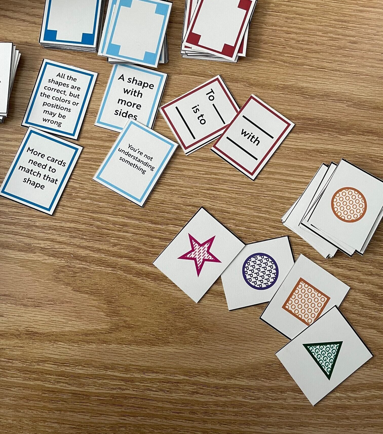 Next, shape cards are dealt out evenly to all team players. These cards vary between 4 different shapes and colors.