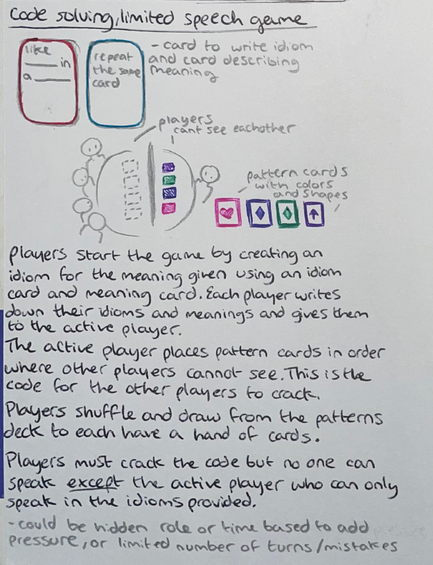 As I wrote down ideas, I referenced specific games that inspired the gameplay. Eventually I came up with a collaborative puzzle game, using limited speech, with mechanics inspired by Decorum, Codenames, and The Mind.